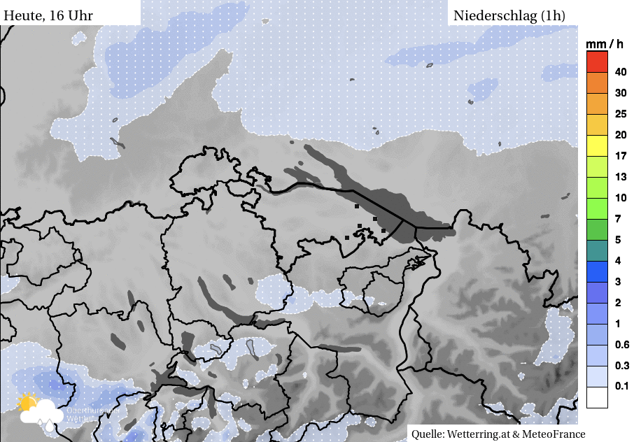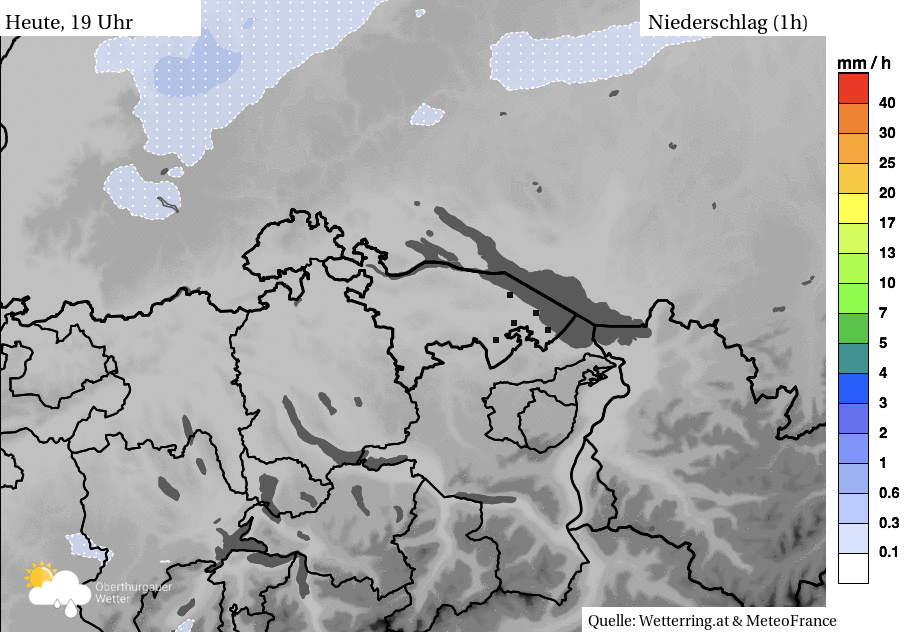Folgende Radarsequenz zeigt den „Regenbatzen“ am Montagabend von Bayern her kommend. Die roten Punkte sind Blitze. Diese wurden aber an der Grenze zur Schweiz fast ausnahmslos sichergestellt.