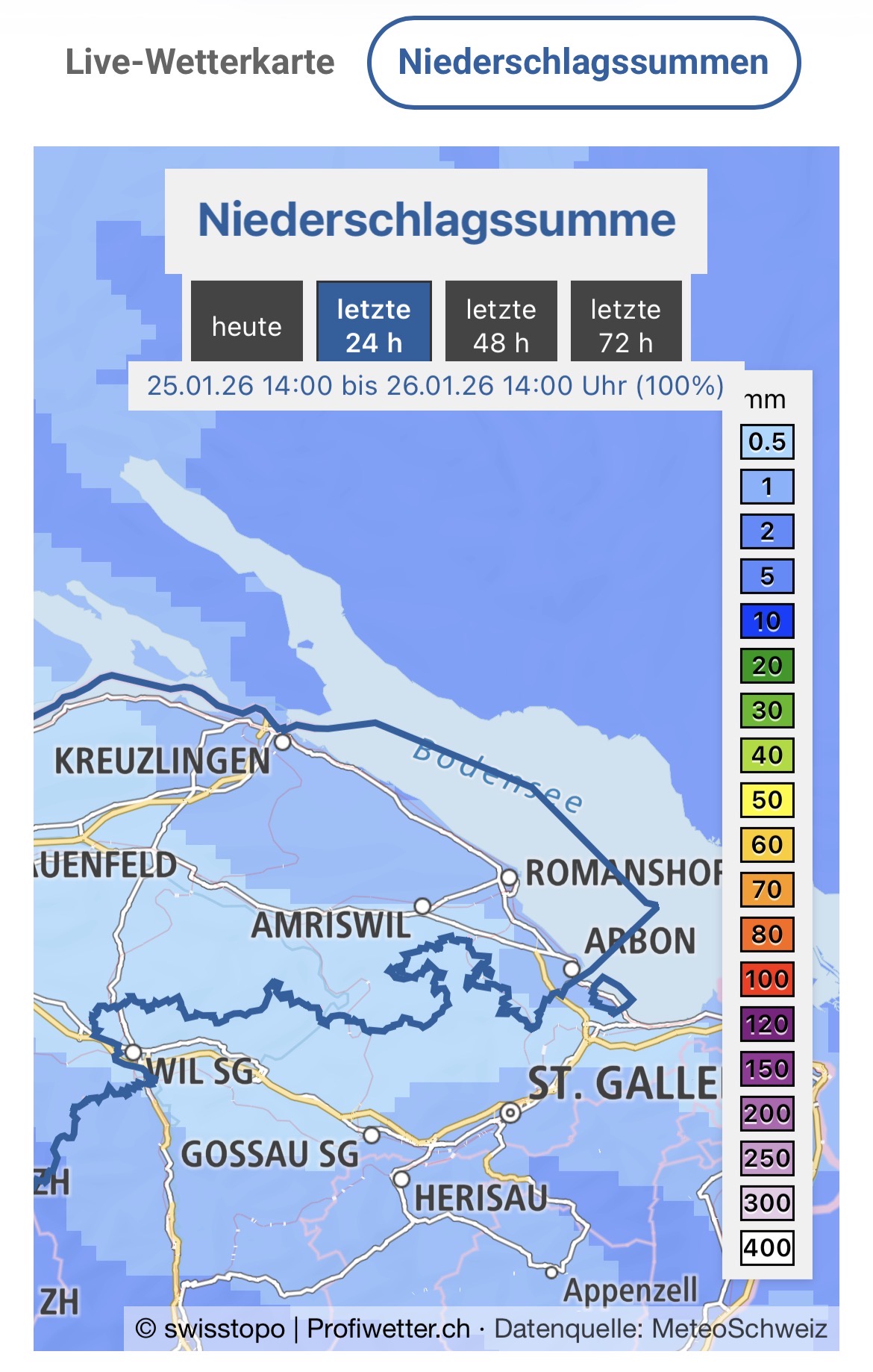 Ein weiteres zusätzliches Produkt ist ebenfalls eine Bereicherung für ein rascher Überblick der gefallenen Niederschlagssummen. Mit der zoombaren, dynamischen Karte sind die Summen der aktuellen vollen Stunde sowie den vergangenen 24, 48 und 72 Stunden ersichtlich. Mit dem Tooltip (mit dem Finger beliebig in die Region tippen) erscheinen dann die Summenzahlen. Ausprobieren lohnt sich!