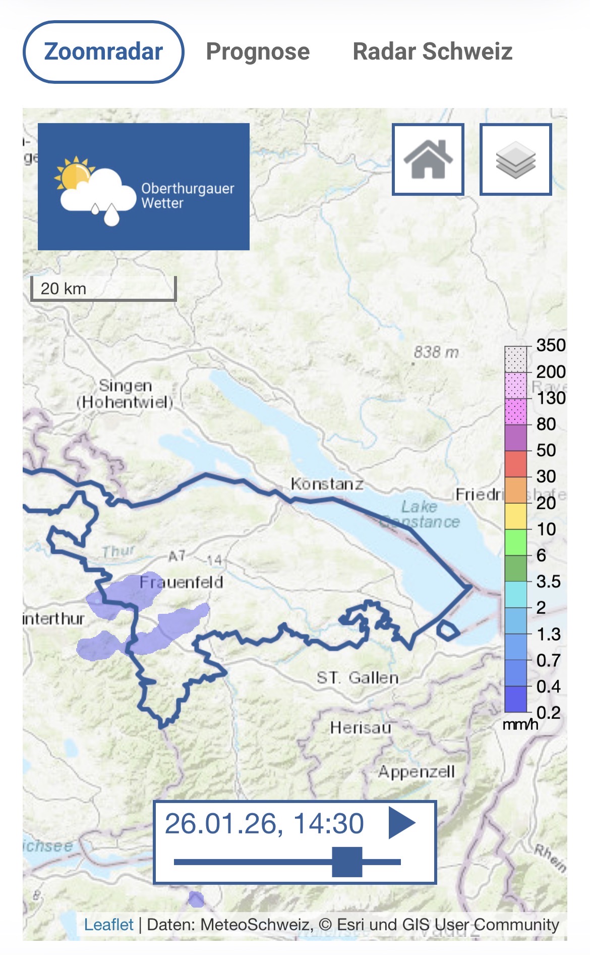 Seit dem dem vom Bund verordneten „Open Data“ im Frühling 2025, sind die Rohdaten von MeteoSchweiz nun für die gesamte Öffentlichkeit verfügbar. Dadurch konnte auch der Radar von Oberthurgauer Wetter auf diese Rohdaten zurückgreifen und umstellen, womit nun ein durchgehendes Radarbild ersichtlich ist.