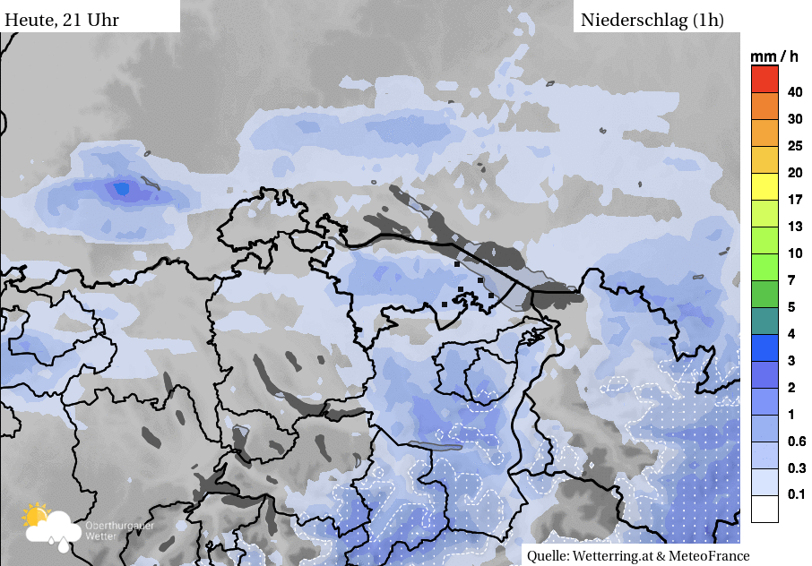 - wir haben da noch die Niederschlagsabkühlung: Das bedeutet; ist der Niederschlag intensiv,so kühlt die umliegende Luft zusätzlich ab.Die Schneeflocke kommt so nicht in milderen Schichten zu “erliegen“ sondern fällt durch die abgekühlten Luftschichten durchwegs in fester Form.Dieser Punkt ist vor allem dann interessant,wenn wie bei Punkt 1 beschrieben,mit der Temperatur sowieso nicht mehr viel fehlt.Die kräftigsten Niederschläge werden für die Nordostschweiz,also auch bei uns berechnet.