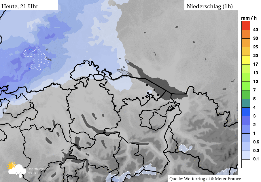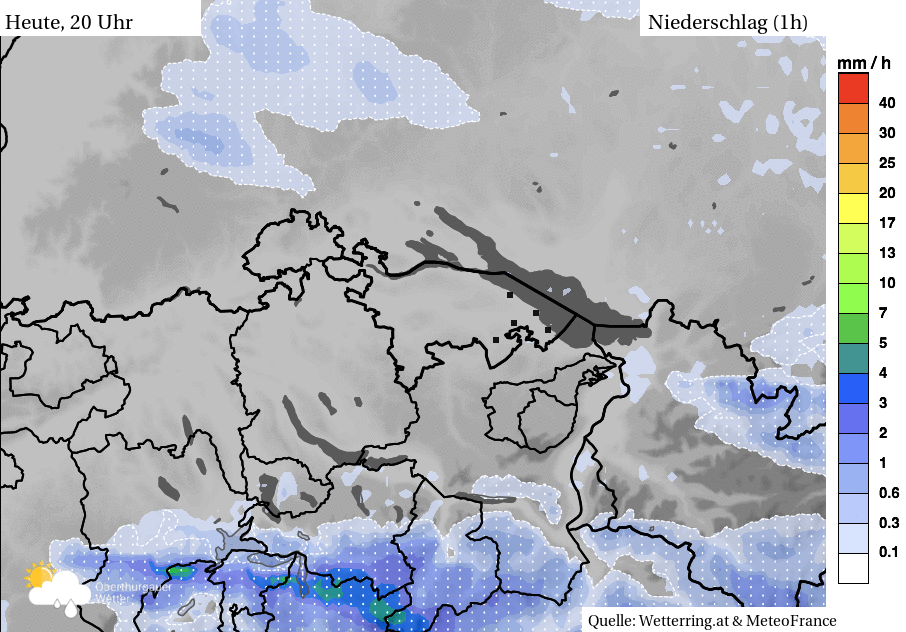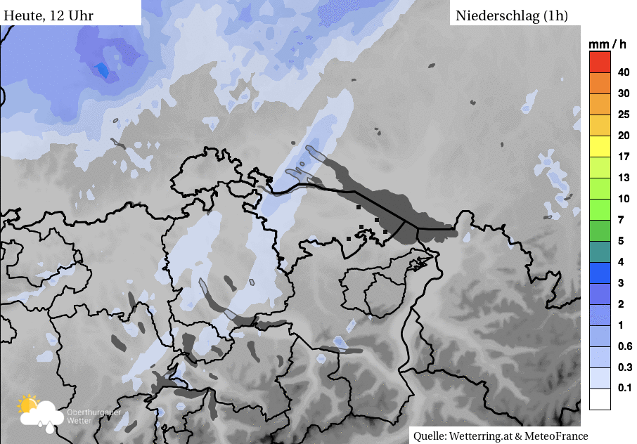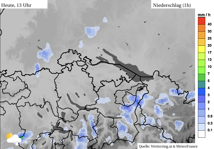Nach der morgendlichen Warmfront (sie brachte zwischen 1.4 und 3.6 mm Regen) folgte ein sonniges Fenster mit hochsommerlichen Temperaturen. Es war bzw. ist ein klassische Abfolge bei Frontdurchgängen: Als erstes steuert ein Tief immer die Warmfront in die Region. Je nachdem wie schnell die nachfolgende Kaltfront ist (gelegentlich und besonders bei „reiferen“ Tiefdruckgebieten holt sie die Warmfront öfters auch ein) liegt ein Bereich mit etwas stabileren Luftschichten, dem sogenannten Warmluftsektor dazwischen – so wie heute. Sehr warme Luft und dazu noch immer eine kräftige Augustsonne liessen also die Temperaturen in die Höhe klettern.